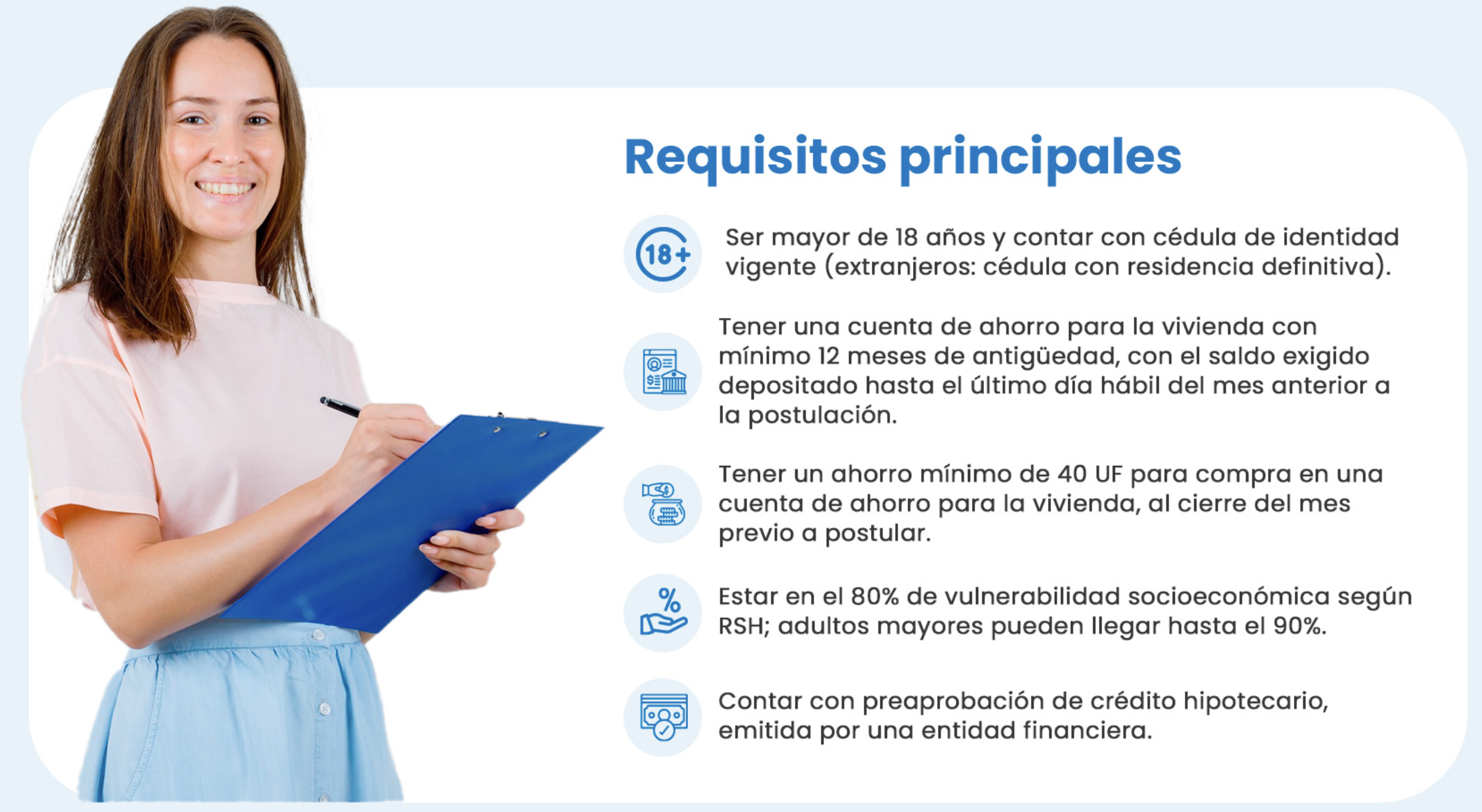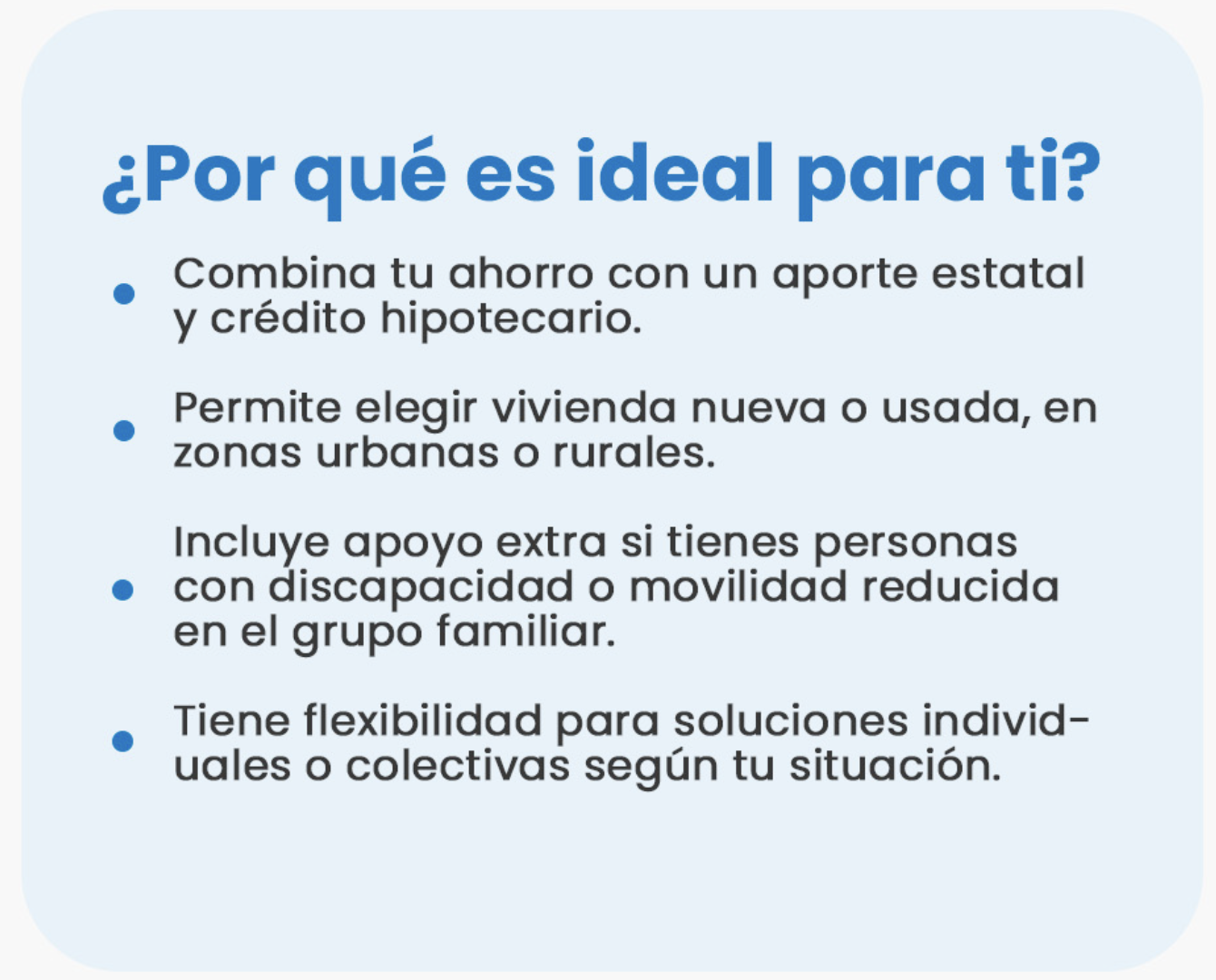 Un beneficio habitacional para familias que no son propietarias, tienen capacidad de ahorro y desean comprar una vivienda nueva o usada, financiada con subsidio o crédito hipotecario. Aplica para viviendas de hasta 1.600 UF (o 1.800 UF en zonas extremas).