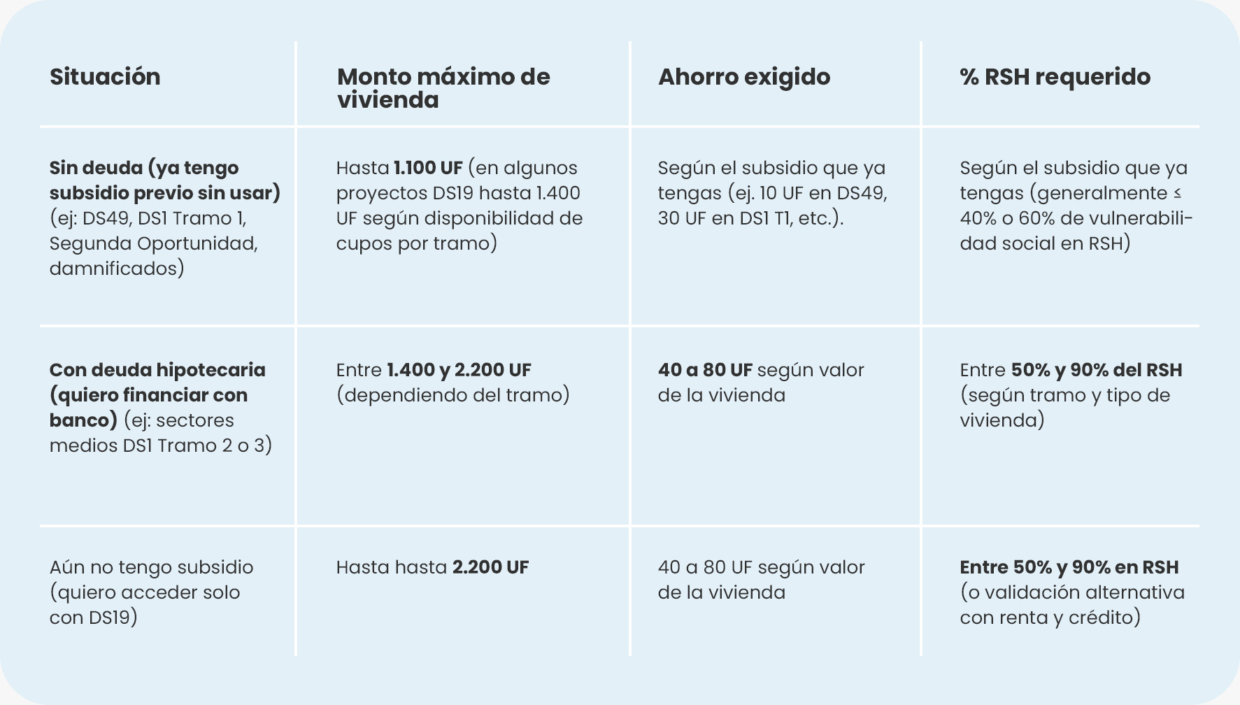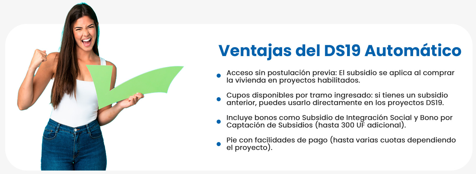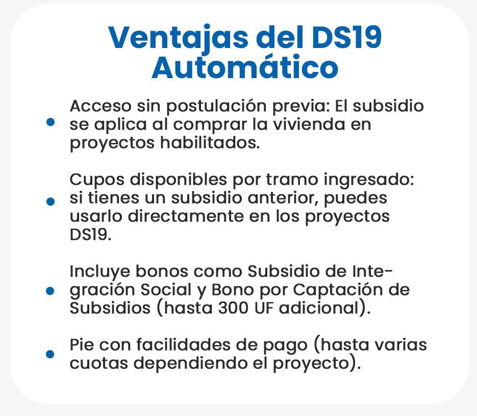 Descubre proyectos con DS19Es una ayuda del Estado que permite comprar una vivienda nueva sin necesidad de postular al MINVU. Solo debes tener tu ahorro y cumplir los requisitos del proyecto donde deseas comprar.No. Puedes acceder directamente a un proyecto DS19 aprobado por el MINVU. Si lo deseas, puedes complementar con crédito hipotecario.Puedes usarlo en un proyecto DS19. Tu subsidio se suma al aporte del Estado y te ayuda a financiar parte del valor de la vivienda.Actualmente puedes acceder a viviendas de hasta 3.000 UF, según el tipo de proyecto y la región donde esté ubicado.Debes estar inscrito en el Registro Social de Hogares (RSH) con un tramo entre el 50 % y 90 %, tener un ahorro mínimo entre 40 y 80 UF depositado en una cuenta para la vivienda, y no ser propietario de otra casa o departamento. También debes acreditar una renta suficiente para complementar el valor de la vivienda (si es con crédito) y cumplir con los requisitos del proyecto DS19 al que postules.